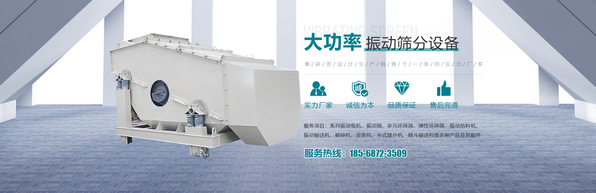 • 主要產品有系列振動電機、振動篩、多元環(huán)保篩、彈性環(huán)保篩、振動給料機、振動輸送機、破碎機、皮帶機、斗式提升機、鏈斗輸送機等多種產品